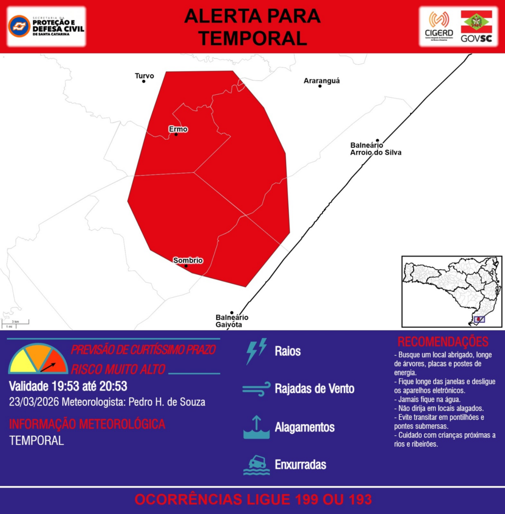 ALERTA – 23/03 19:53 – TEMPORAL com RAIOS, RAJADAS DE VENTO, ALAGAMENTOS e risco de ENXURRADAS para áreas dos municípios de Araranguá, Balneário Arroio do Silva, Balneário Gaivota, Ermo, Sombrio e Turvo na próxima hora. Ocorrências ligue 199 ou 193.