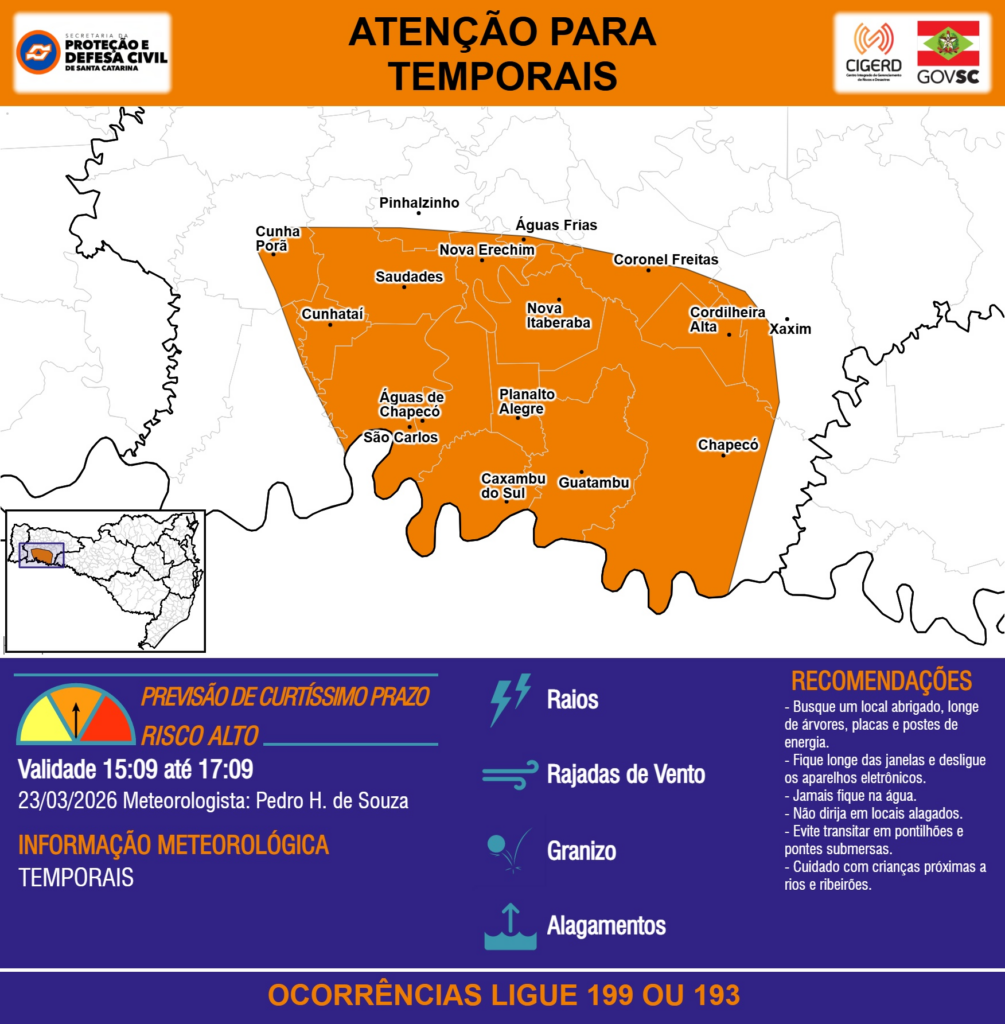 ATENÇÃO – 23/03 15:09 – TEMPORAIS com RAIOS, RAJADAS DE VENTO, GRANIZO e ALAGAMENTOS para áreas da região do Oeste nas próximas 2 horas. Ocorrências ligue 199 ou 193.