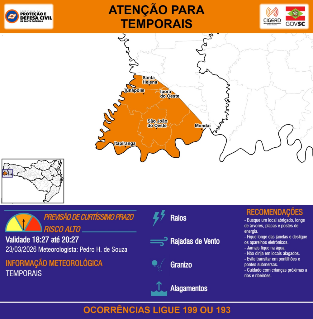 ATENÇÃO – 23/03 18:27 – TEMPORAIS com RAIOS, RAJADAS DE VENTO, GRANIZO e ALAGAMENTOS para os municípios de Iporã do Oeste, Itapiranga, Mondaí, Santa Helena, São João do Oeste e Tunápolis nas próximas 2 horas. Ocorrências ligue 199 ou 193.