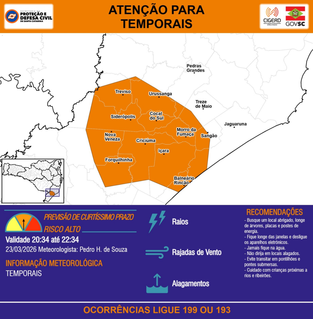 ATENÇÃO – 23/03 20:34 – TEMPORAIS com RAIOS, RAJADAS DE VENTO e ALAGAMENTOS para áreas dos municípios de Balneário Rincão, Cocal do Sul, Criciúma, Forquilhinha, Içara, Jaguaruna, Morro da Fumaça, Nova Veneza, Pedras Grandes, Sangão, Siderópolis, Treviso, Treze de Maio e Urussanga nas próximas 2 horas. Ocorrências ligue 199 ou 193.
