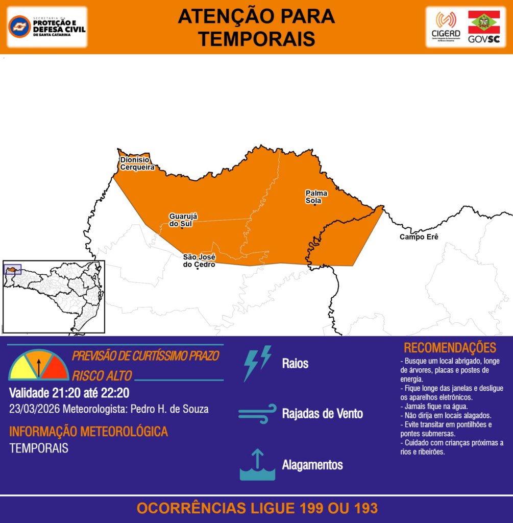 ATENÇÃO – 23/03 21:20 – TEMPORAIS com RAIOS, RAJADAS DE VENTO e ALAGAMENTOS para áreas dos municípios de Campo Erê, Dionísio Cerqueira, Guarujá do Sul, Palma Sola e São José do Cedro na próxima hora. Ocorrências ligue 199 ou 193.