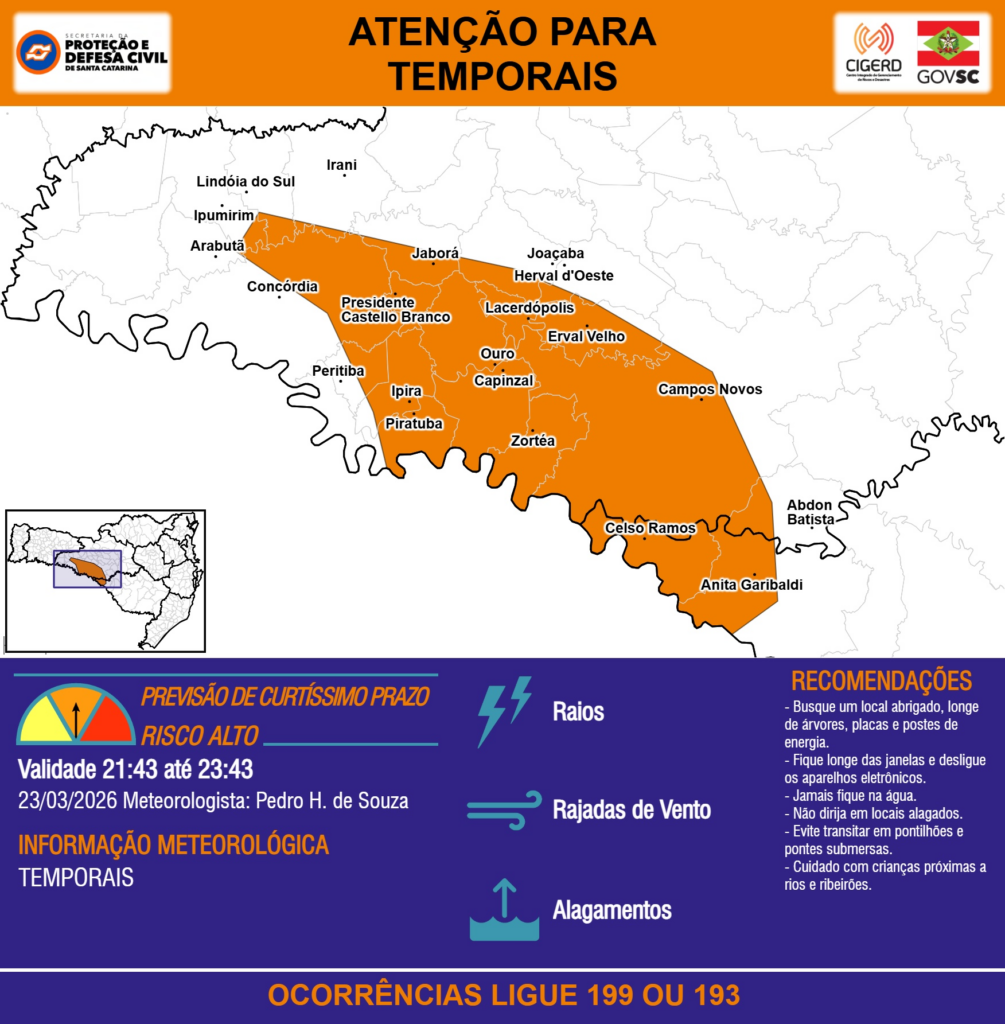 ATENÇÃO – 23/03 21:43 – TEMPORAIS com RAIOS, RAJADAS DE VENTO e ALAGAMENTOS para áreas dos municípios de Abdon Batista, Anita Garibaldi, Arabutã, Campos Novos, Capinzal, Celso Ramos, Concórdia, Erval Velho, Herval d’Oeste, Ipira, Ipumirim, Irani, Jaborá, Joaçaba, Lacerdópolis, Lindóia do Sul, Ouro, Peritiba, Piratuba, Presidente Castello Branco e Zortéa nas próximas 2 horas. Ocorrências ligue 199 ou 193.