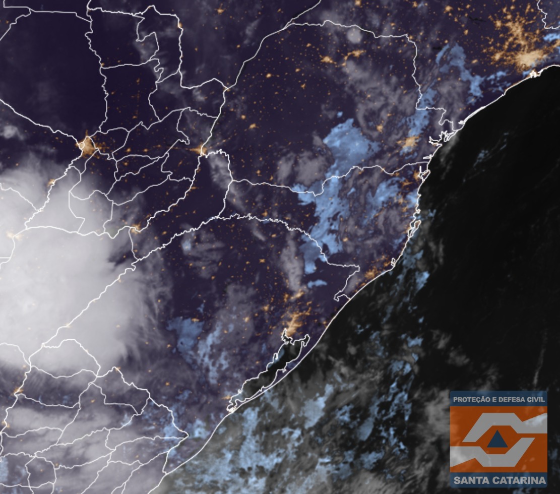 Figura: Imagem do satélite GOES-19, produto GeoColor, às 05h20 horário local. Fonte: RAMMB/CIRA, adaptado por SDC/SC.