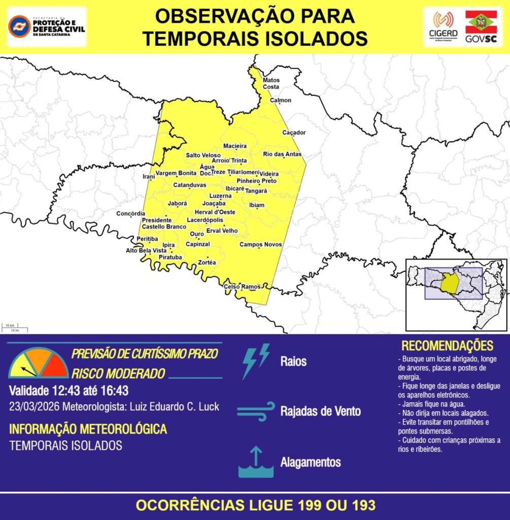 OBSERVAÇÃO – 23/03 12:38 – TEMPORAIS ISOLADOS de intensidade moderada a forte com RAIOS, RAJADAS DE VENTO e ALAGAMENTOS pontuais para os municípios de Alto Bela Vista, Arroio Trinta, Calmon, Campos Novos, Capinzal, Catanduvas, Caçador, Celso Ramos, Concórdia, Erval Velho, Herval d’Oeste, Ibiam, Ibicaré, Iomerê, Ipira, Irani, Jaborá, Joaçaba, Lacerdópolis, Luzerna, Macieira, Matos Costa, Ouro, Peritiba, Pinheiro Preto, Piratuba, Presidente Castello Branco, Rio das Antas, Salto Veloso, Tangará, Treze Tílias, Vargem Bonita, Videira, Zortéa e Água Doce nas próximas 4 horas. Ocorrências ligue 199 ou 193.