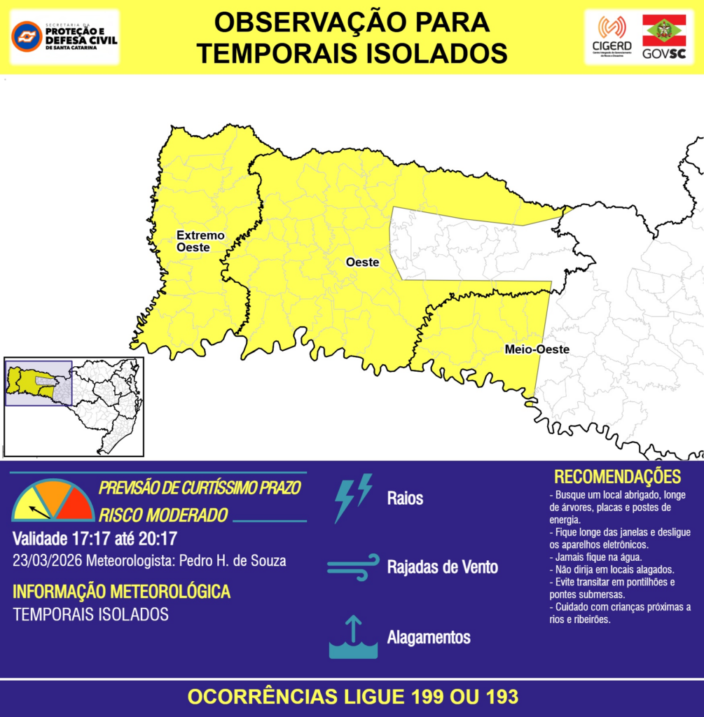 OBSERVAÇÃO – 23/03 17:17 – TEMPORAIS ISOLADOS com RAIOS, RAJADAS DE VENTO e ALAGAMENTOS pontuais para áreas das regiões do Extremo Oeste, Oeste e Meio-Oeste nas próximas 3 horas. Ocorrências ligue 199 ou 193.