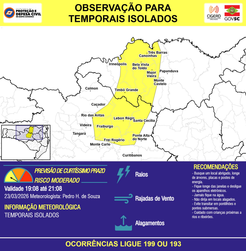 OBSERVAÇÃO – 23/03 19:08 – TEMPORAIS ISOLADOS com RAIOS, RAJADAS DE VENTO e ALAGAMENTOS pontuais para áreas das regiões do Meio-Oeste e Planalto Norte nas próximas 2 horas. Ocorrências ligue 199 ou 193.