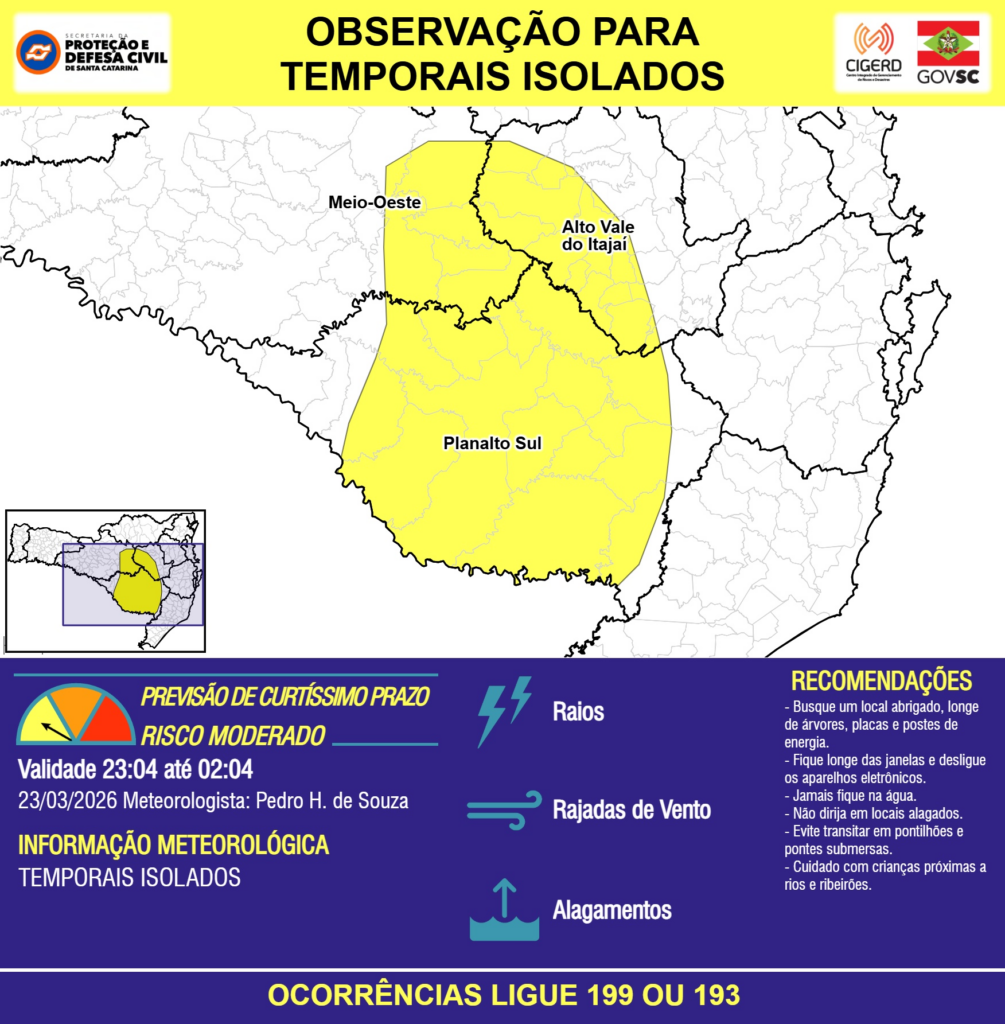 OBSERVAÇÃO – 23/03 23:04 – TEMPORAIS ISOLADOS com RAIOS, RAJADAS DE VENTO e ALAGAMENTOS pontuais para áreas das regiões do Meio-Oeste, Planalto Sul e Alto Vale do Itajaí nas próximas 3 horas. Ocorrências ligue 199 ou 193.