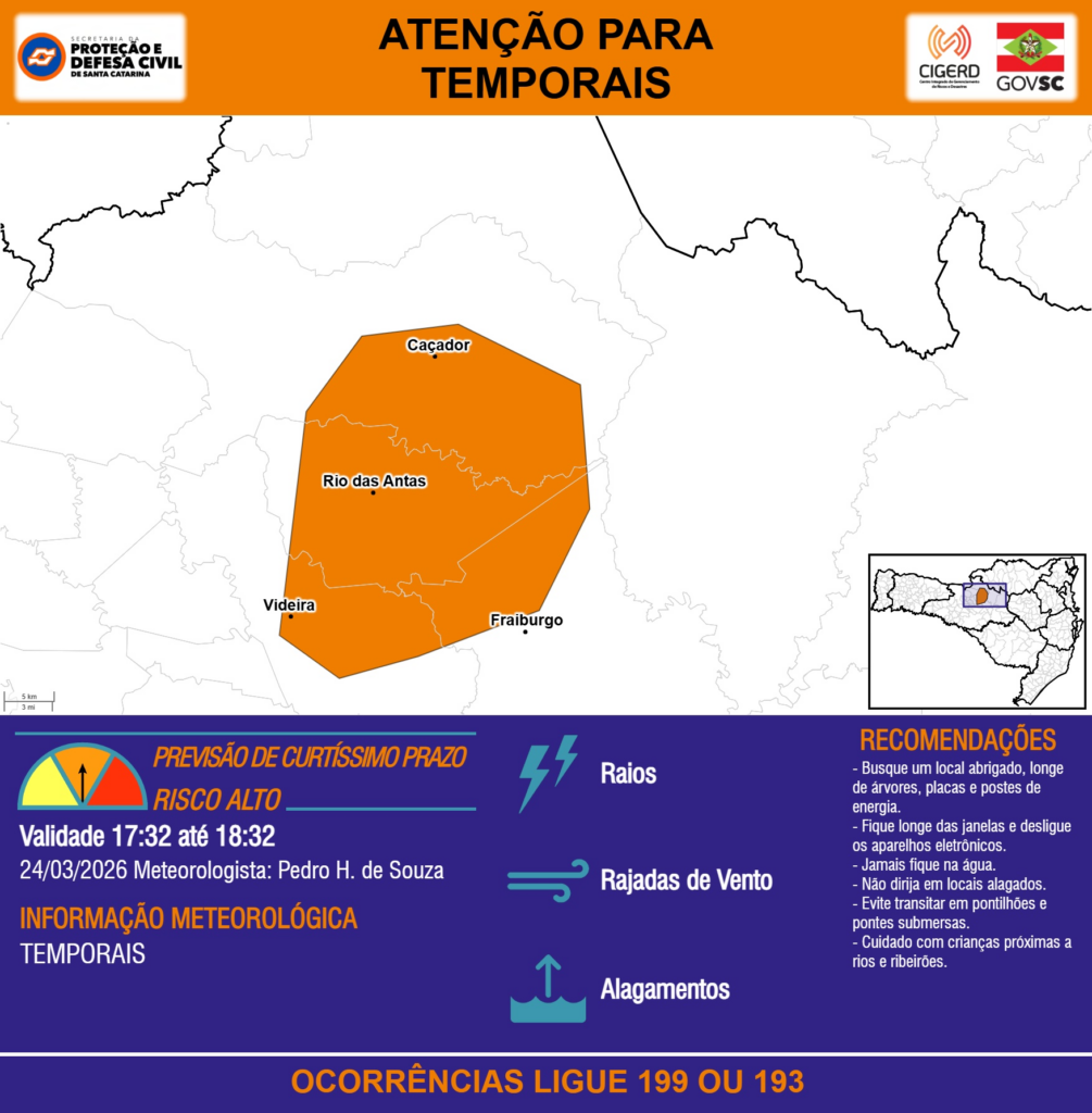 ATENÇÃO – 24/03 17:32 – TEMPORAIS com RAIOS, RAJADAS DE VENTO e ALAGAMENTOS para os municípios de Caçador, Fraiburgo, Rio das Antas e Videira na próxima hora. Ocorrências ligue 199 ou 193.