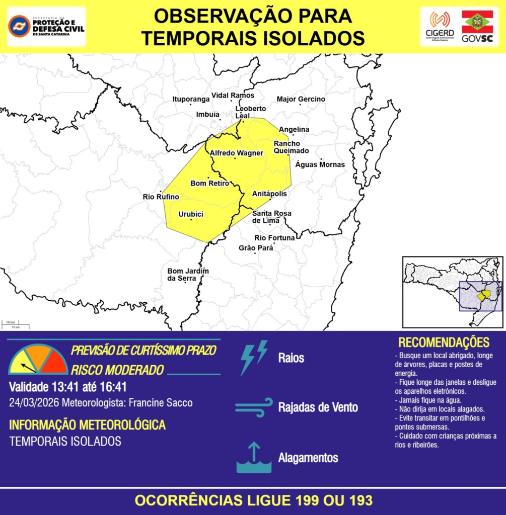 OBSERVAÇÃO – 24/03 13:41 – TEMPORAIS ISOLADOS com RAIOS, RAJADAS DE VENTO e ALAGAMENTOS pontuais para as regiões do Planalto Sul, Litoral Sul, Grande Florianópolis e Alto Vale do Itajaí nas próximas 3 horas. Ocorrências ligue 199 ou 193.