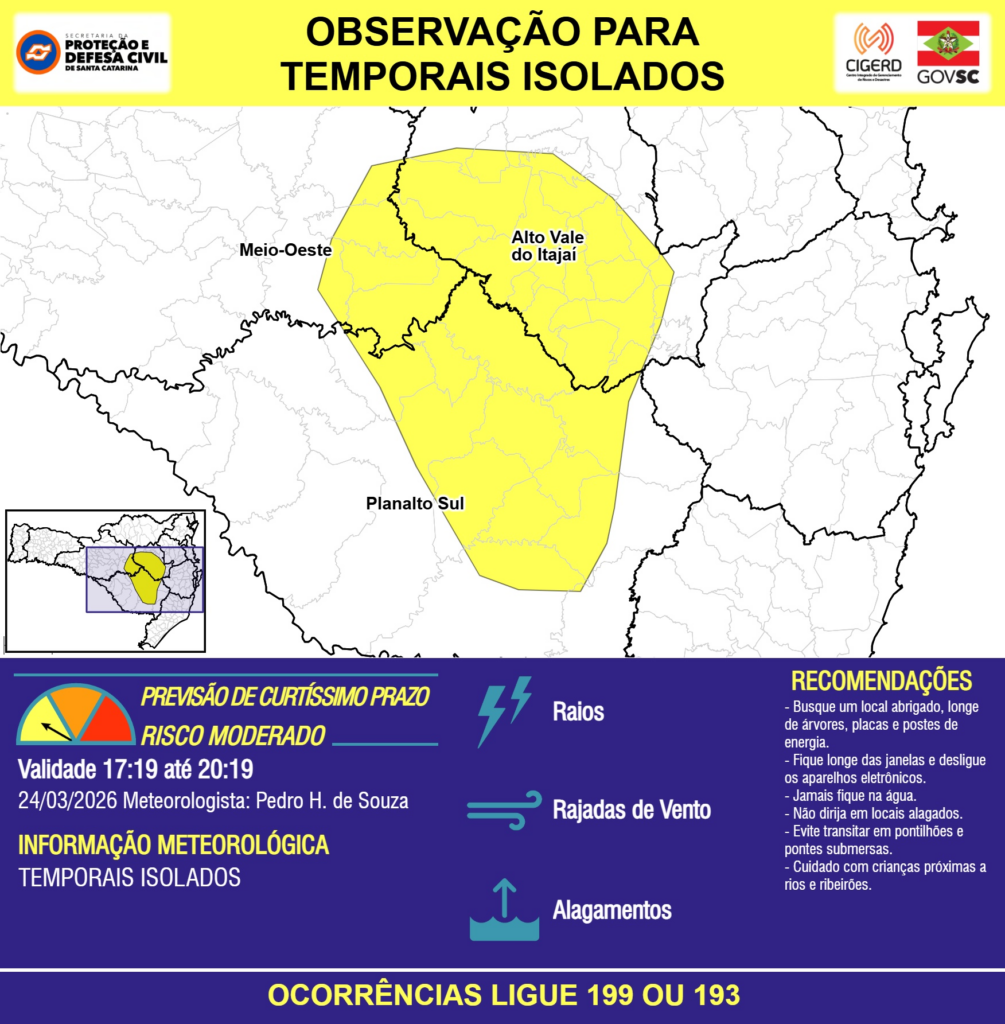 OBSERVAÇÃO – 24/03 17:19 – TEMPORAIS ISOLADOS com RAIOS, RAJADAS DE VENTO e ALAGAMENTOS pontuais para áreas das regiões do Meio-Oeste, Planalto Sul e Alto Vale do Itajaí nas próximas 3 horas. Ocorrências ligue 199 ou 193.
