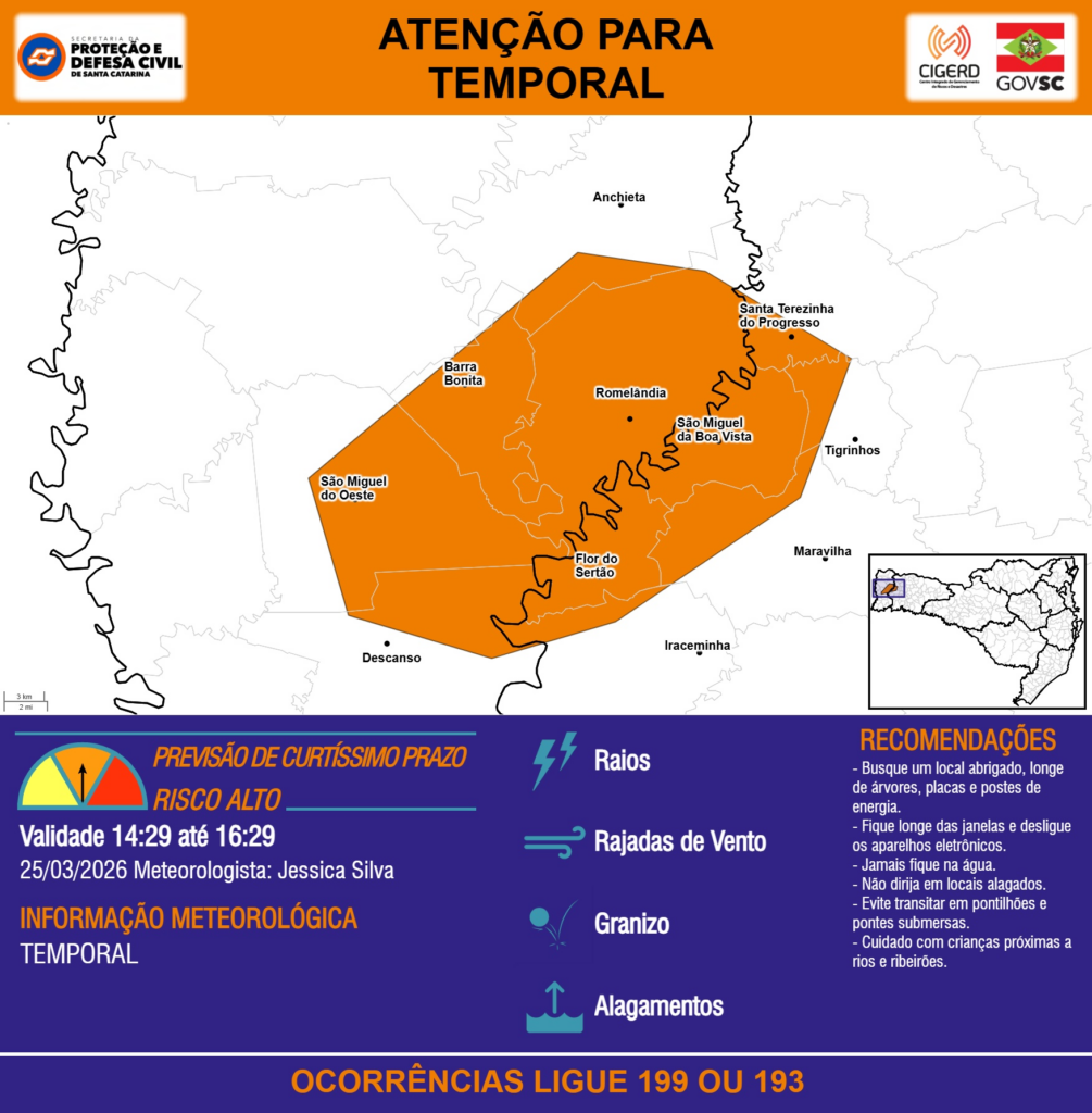 ATENÇÃO – 25/03 14:29 – TEMPORAL com RAIOS, RAJADAS DE VENTO, GRANIZO e ALAGAMENTOS para os municípios de Anchieta, Barra Bonita, Descanso, Flor do Sertão, Iraceminha, Maravilha, Romelândia, Santa Terezinha do Progresso, São Miguel da Boa Vista, São Miguel do Oeste e Tigrinhos nas próximas 2 horas. Ocorrências ligue 199 ou 193.