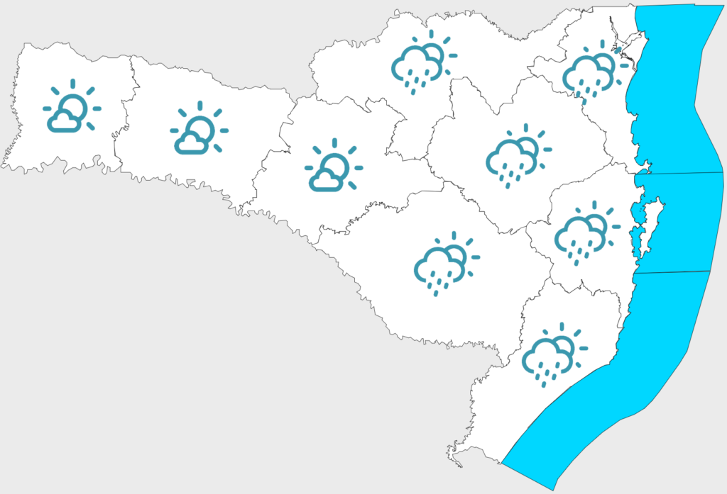 A quarta-feira (25) começa com predomínio de tempo estável pelo estado, exceto em áreas do litoral, onde não se descarta a ocorrência de chuva passageira, sobretudo no início e final do dia. A partir da tarde, o aquecimento e a umidade somadas a presença de uma área de baixa pressão em superfície, favorece a formação de temporais isolados em algumas áreas, especialmente no Grande Oeste e divisa com o RS. O risco é baixo para ocorrências associadas a alagamentos pontuais, destelhamentos e danos na rede elétrica. As temperaturas seguem altas, variando entre 13°C e 17°C nas áreas serranas e entre 20°C e 23°C no Litoral. Durante à tarde, se aproximam dos 30°C/32°C no Oeste e Litoral Sul e entre 27°C e 30°C nas demais regiões.