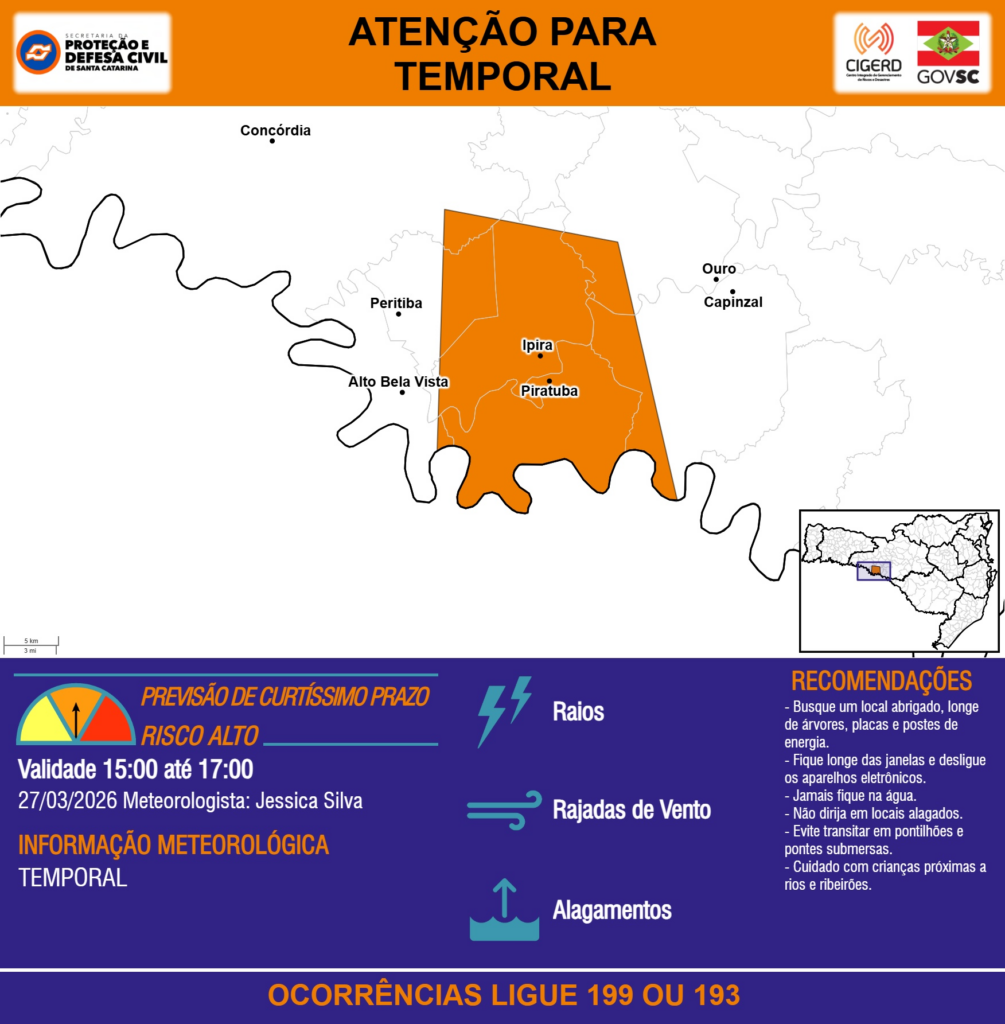 ATENÇÃO – 27/03 15:00 – TEMPORAL com RAIOS, RAJADAS DE VENTO e ALAGAMENTOS para os municípios de Alto Bela Vista, Capinzal, Concórdia, Ipira, Ouro, Peritiba e Piratuba nas próximas 2 horas. Ocorrências ligue 199 ou 193.