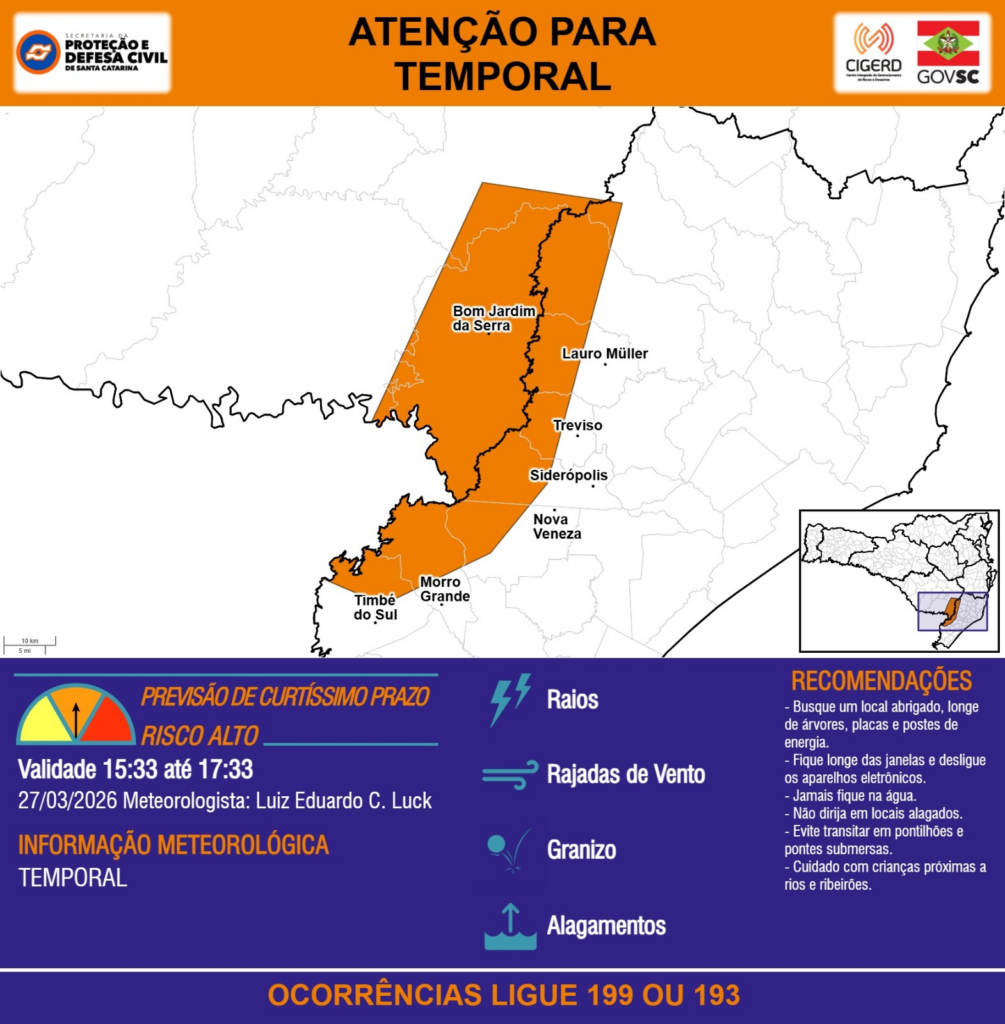 ATENÇÃO – 27/03 15:33 – TEMPORAL com RAIOS, RAJADAS DE VENTO, GRANIZO e ALAGAMENTOS para os municípios de Bom Jardim da Serra, Lauro Müller, Morro Grande, Nova Veneza, Siderópolis e Treviso nas próximas 2 horas. Ocorrências ligue 199 ou 193.