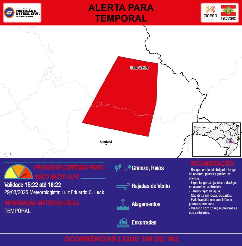 ALERTA – 29/03 15:22 – TEMPORAL com RAJADAS DE VENTO, ALAGAMENTOS, GRANIZO, RAIOS e risco de ENXURRADAS para os municípios de Bom Retiro e Urubici na próxima hora. Ocorrências ligue 199 ou 193.