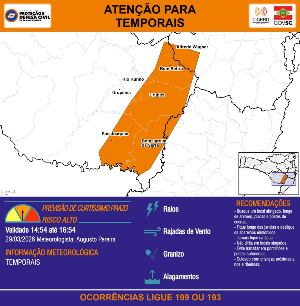ATENÇÃO – 29/03 14:54 – TEMPORAIS com RAIOS, RAJADAS DE VENTO, GRANIZO e ALAGAMENTOS para os municípios de Alfredo Wagner, Bom Jardim da Serra, Bom Retiro, Rio Rufino, São Joaquim, Urubici e Urupema nas próximas 2 horas. Ocorrências ligue 199 ou 193.
