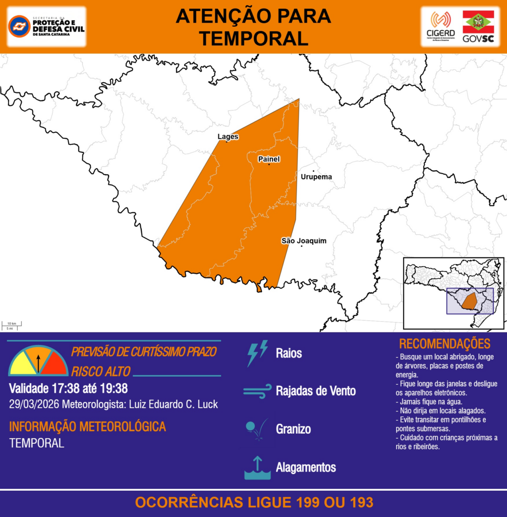 ATENÇÃO – 29/03 17:38 – TEMPORAL com RAIOS, RAJADAS DE VENTO, GRANIZO e ALAGAMENTOS para os municípios de Lages, Painel, São Joaquim e Urupema nas próximas 2 horas. Ocorrências ligue 199 ou 193.