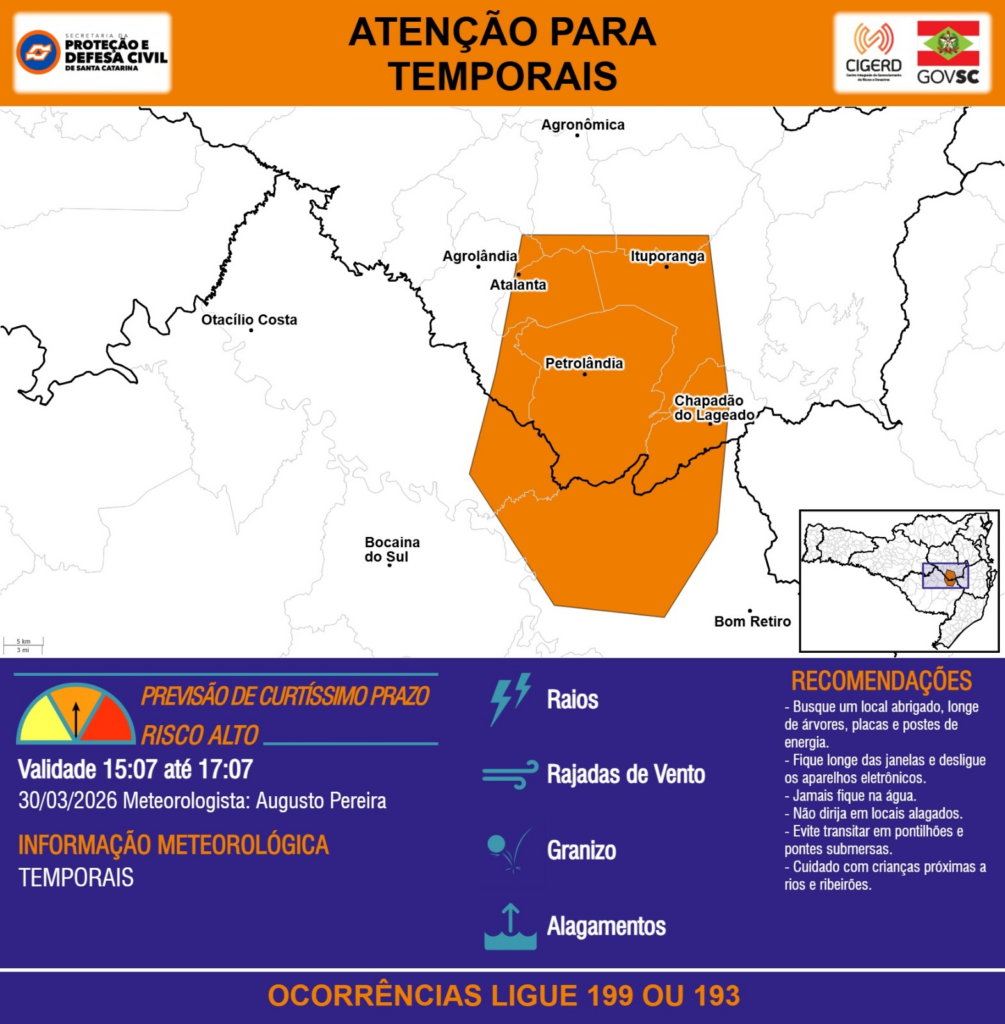 ATENÇÃO – 30/03 15:07 – TEMPORAIS com RAIOS, RAJADAS DE VENTO, GRANIZO e ALAGAMENTOS para os municípios de Agrolândia, Agronômica, Atalanta, Bocaina do Sul, Bom Retiro, Chapadão do Lageado, Ituporanga, Otacílio Costa e Petrolândia nas próximas 2 horas. Ocorrências ligue 199 ou 193.