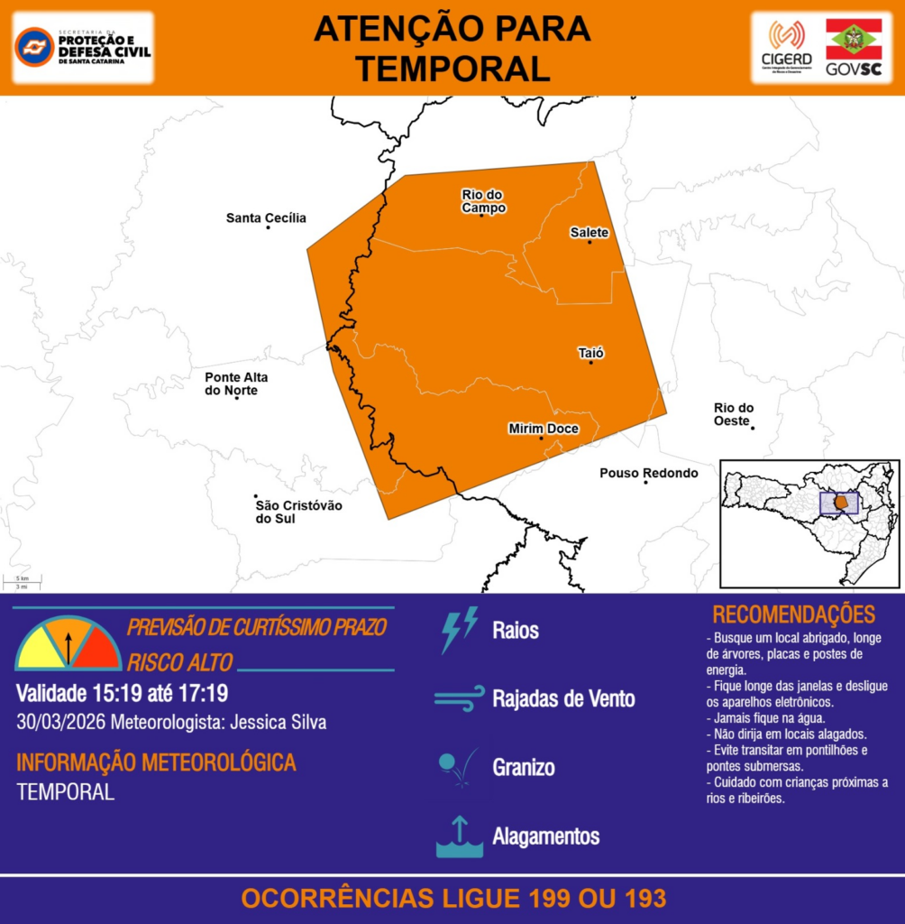 ATENÇÃO – 30/03 15:19 – TEMPORAL com RAIOS, RAJADAS DE VENTO, GRANIZO e ALAGAMENTOS para os municípios de Mirim Doce, Ponte Alta do Norte, Pouso Redondo, Rio do Campo, Rio do Oeste, Salete, Santa Cecília, São Cristóvão do Sul e Taió nas próximas 2 horas. Ocorrências ligue 199 ou 193.
