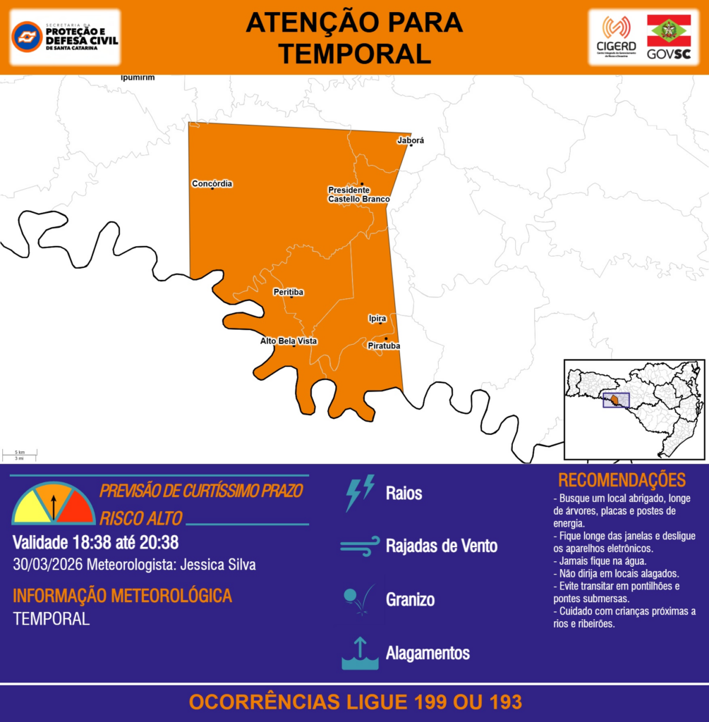 ATENÇÃO – 30/03 18:38 – TEMPORAL com RAIOS, RAJADAS DE VENTO, GRANIZO e ALAGAMENTOS para os municípios de Alto Bela Vista, Concórdia, Ipira, Ipumirim, Jaborá, Peritiba, Piratuba e Presidente Castello Branco nas próximas 2 horas. Ocorrências ligue 199 ou 193.