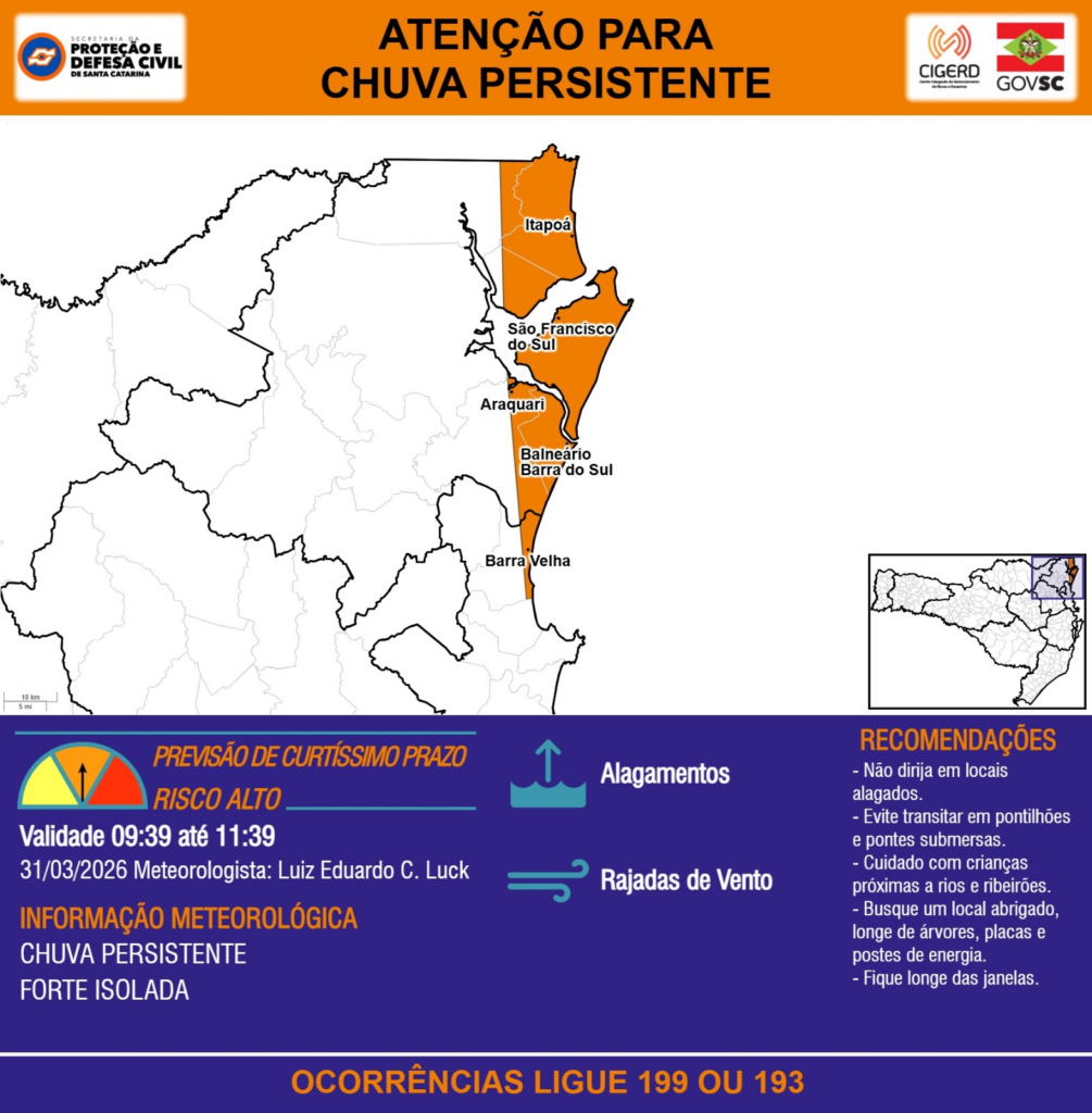 ATENÇÃO – 31/03 09:39 – CHUVA PERSISTENTE de intensidade forte isolada com ALAGAMENTOS e RAJADAS DE VENTO para os municípios de Araquari, Balneário Barra do Sul, Barra Velha, Itapoá e São Francisco do Sul nas próximas 2 horas. Ocorrências ligue 199 ou 193.
