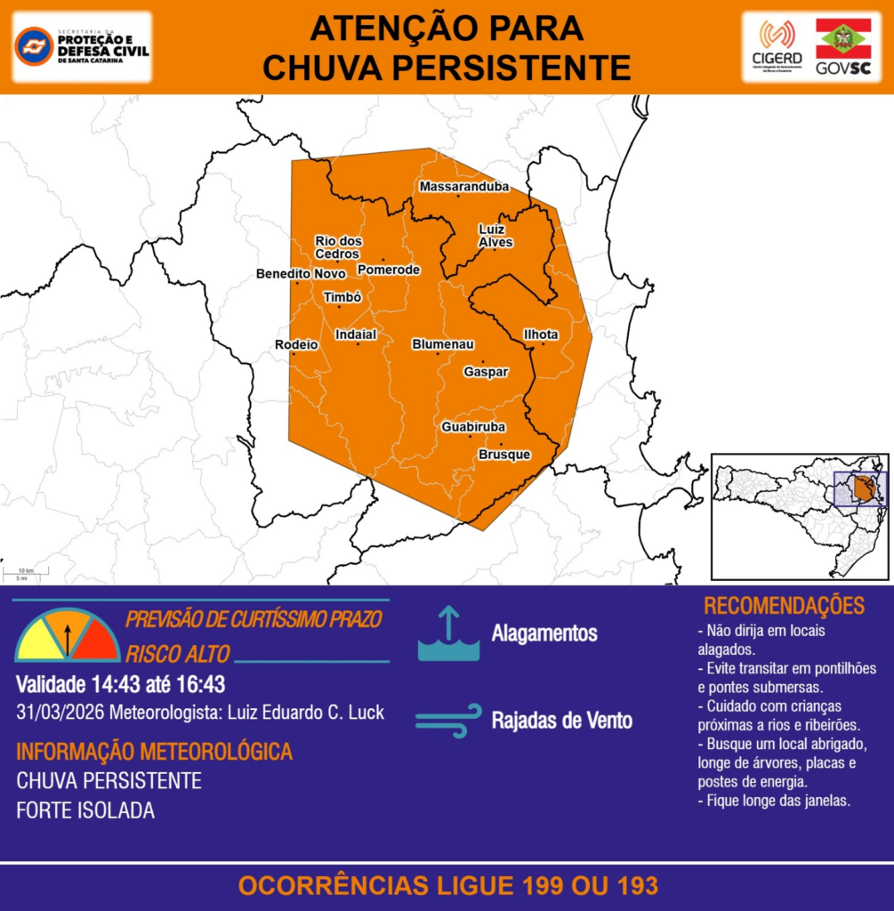 ATENÇÃO – 31/03 14:43 – CHUVA PERSISTENTE de intensidade forte isolada com ALAGAMENTOS e RAJADAS DE VENTO para os municípios de Benedito Novo, Blumenau, Brusque, Gaspar, Guabiruba, Ilhota, Indaial, Luiz Alves, Massaranduba, Pomerode, Rio dos Cedros, Rodeio e Timbó nas próximas 2 horas. Ocorrências ligue 199 ou 193.