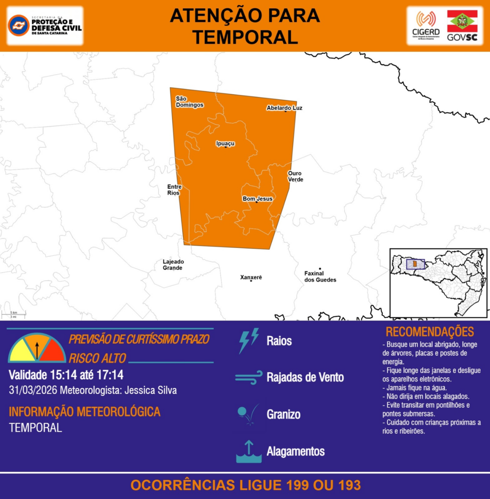 ATENÇÃO – 31/03 15:14 – TEMPORAL com RAIOS, RAJADAS DE VENTO, GRANIZO e ALAGAMENTOS para os municípios de Abelardo Luz, Bom Jesus, Entre Rios, Faxinal dos Guedes, Ipuaçu, Lajeado Grande, Ouro Verde, São Domingos e Xanxerê nas próximas 2 horas. Ocorrências ligue 199 ou 193.