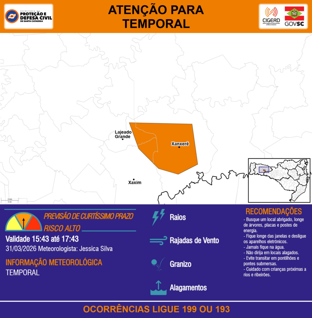 ATENÇÃO – 31/03 15:43 – TEMPORAL com RAIOS, RAJADAS DE VENTO, GRANIZO e ALAGAMENTOS para os municípios de Lajeado Grande, Xanxerê e Xaxim nas próximas 2 horas. Ocorrências ligue 199 ou 193.