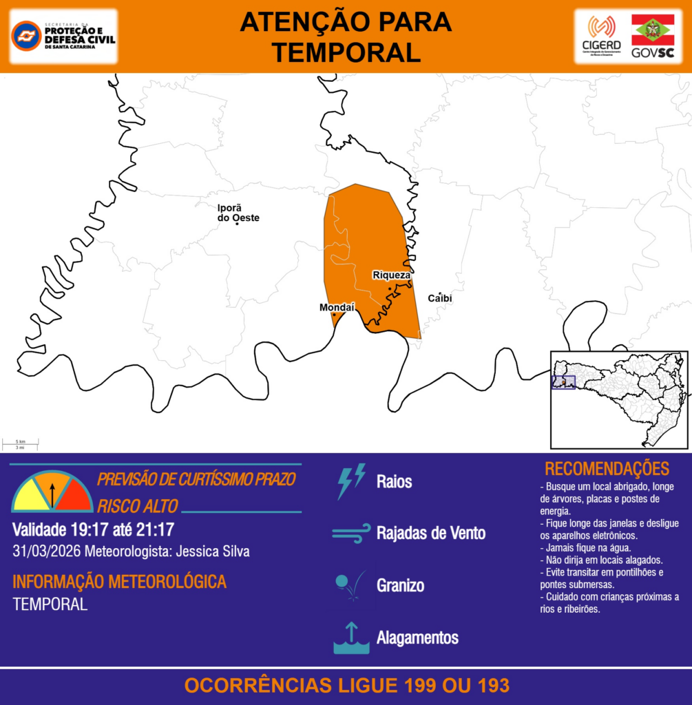 ATENÇÃO – 31/03 19:17 – TEMPORAL com RAIOS, RAJADAS DE VENTO, GRANIZO e ALAGAMENTOS para os municípios de Caibi, Iporã do Oeste, Mondaí e Riqueza nas próximas 2 horas. Ocorrências ligue 199 ou 193.
