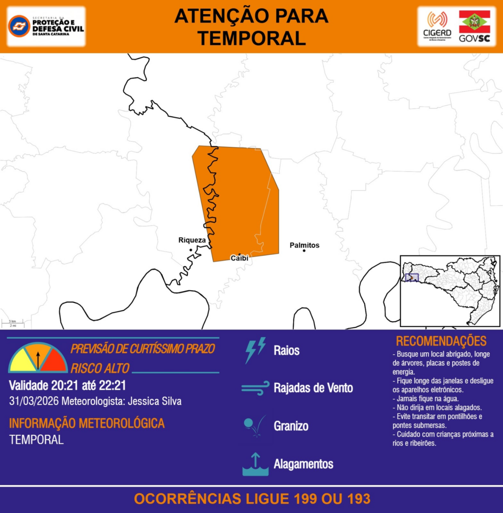 ATENÇÃO – 31/03 20:21 – TEMPORAL com RAIOS, RAJADAS DE VENTO, GRANIZO e ALAGAMENTOS para os municípios de Caibi, Palmitos e Riqueza nas próximas 2 horas. Ocorrências ligue 199 ou 193.