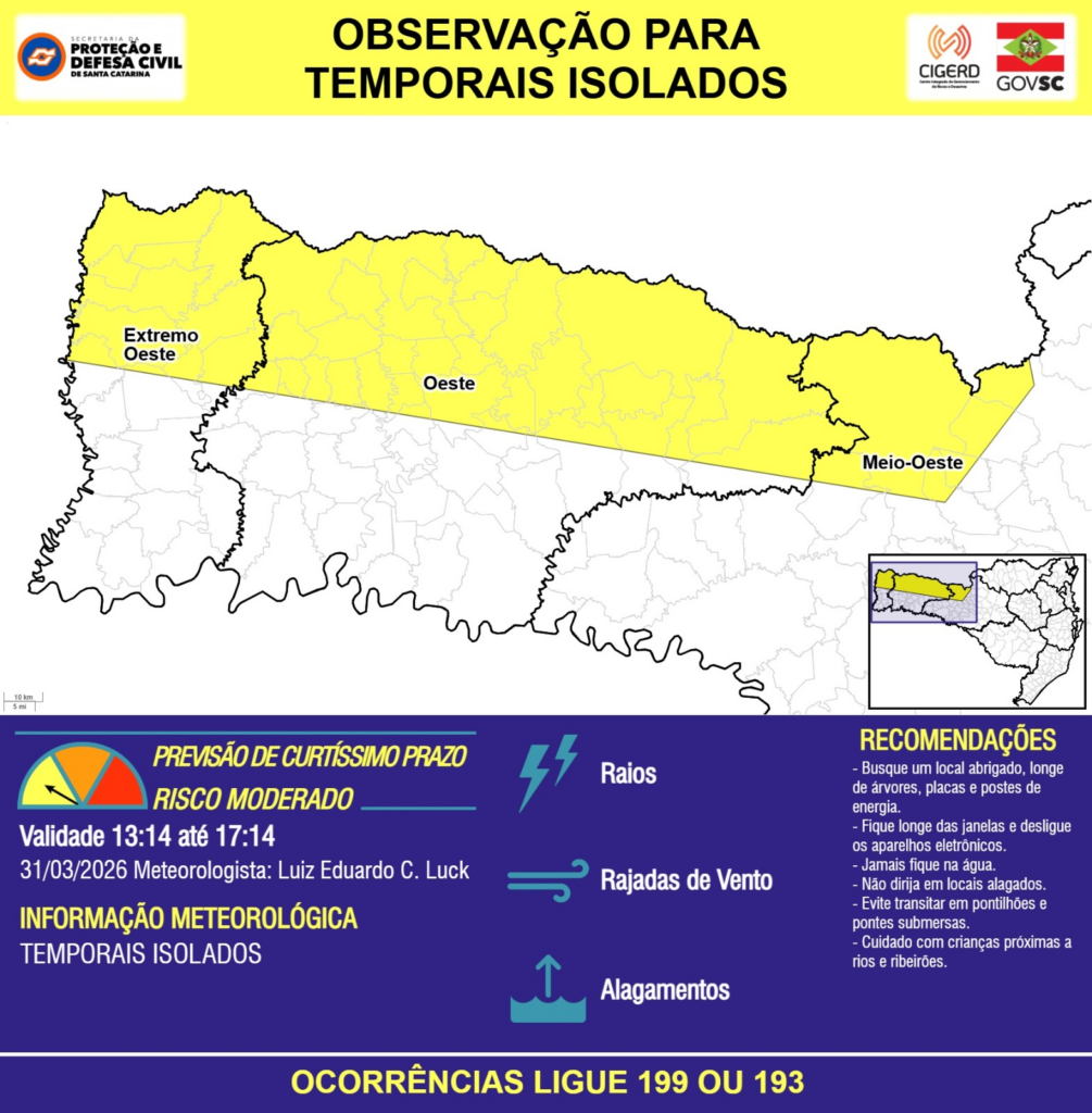 OBSERVAÇÃO – 31/03 13:14 – TEMPORAIS ISOLADOS com RAIOS, RAJADAS DE VENTO e ALAGAMENTOS pontuais para as regiões do Extremo Oeste, Oeste e Meio-Oeste nas próximas 4 horas. Ocorrências ligue 199 ou 193.