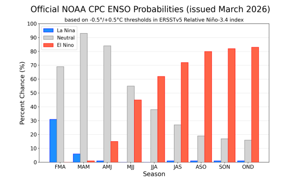 Figura 1: Previsão probabilística do fenômeno El Niño – Oscilação Sul nos próximos trimestres. Fonte: Climate Prediction Center (CPC).