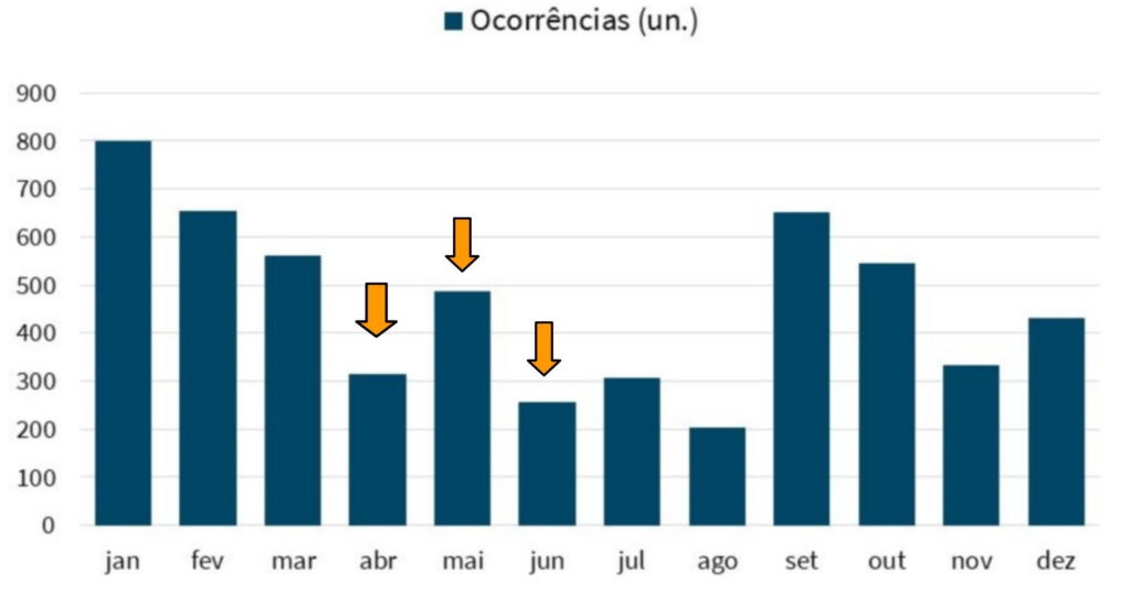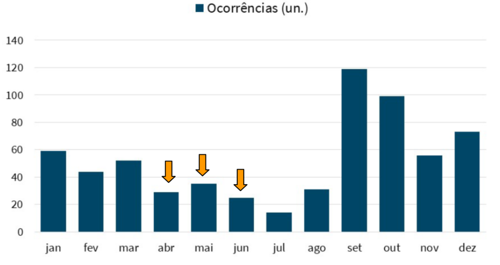 O trimestre composto por abril, maio e junho apresenta uma menor participação no total anual de ocorrências, embora ainda registre episódios relevantes, especialmente no mês de maio. Abril marca uma redução significativa no número de ocorrências, após três meses consecutivos com registros elevados. Em maio, observa-se uma nova elevação, seguida por outro período de diminuição no número de eventos.