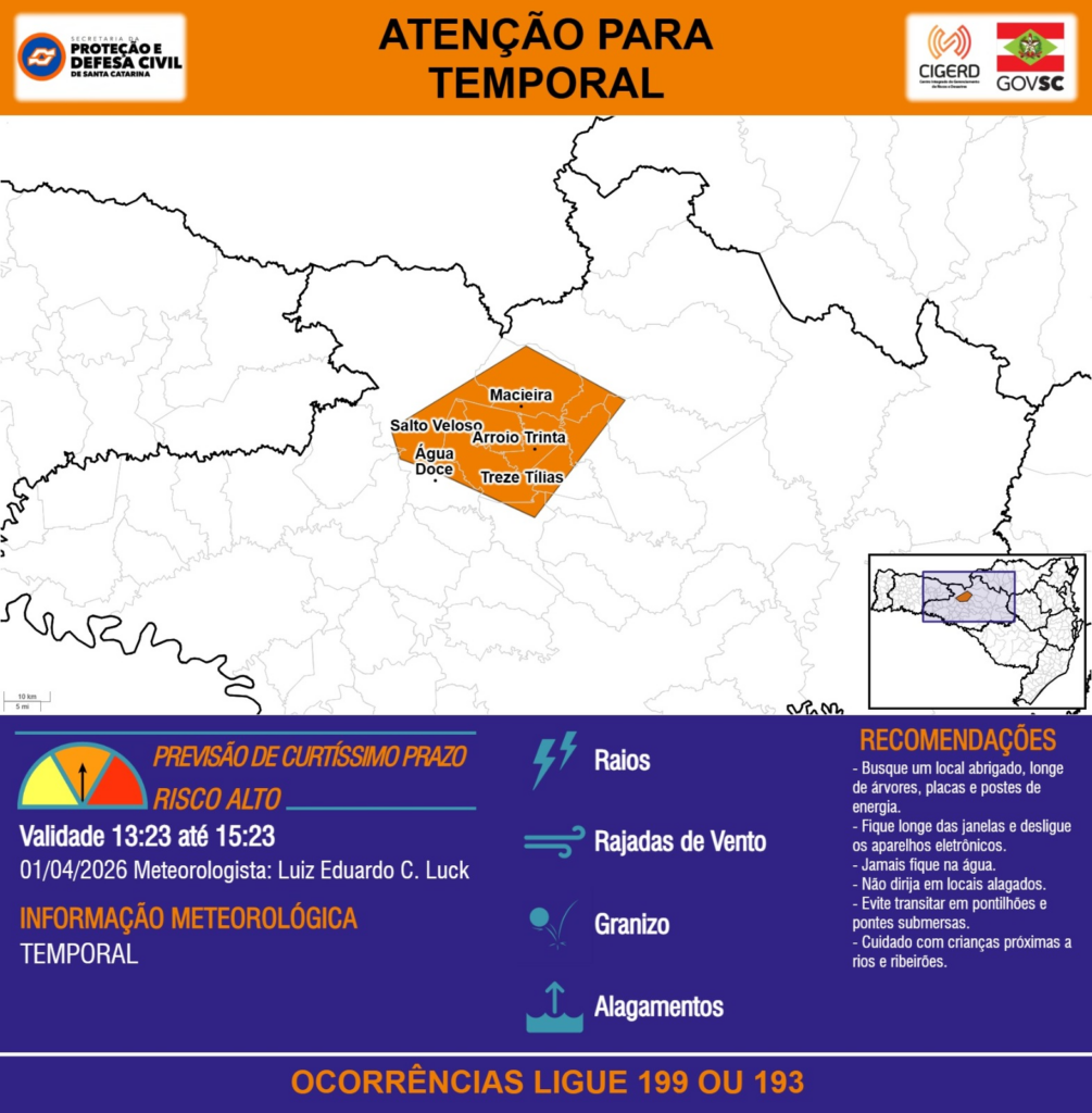 ATENÇÃO – 01/04 13:23 – TEMPORAL com RAIOS, RAJADAS DE VENTO, GRANIZO e ALAGAMENTOS para os municípios de Arroio Trinta, Macieira, Salto Veloso, Treze Tílias e Água Doce nas próximas 2 horas. Ocorrências ligue 199 ou 193.