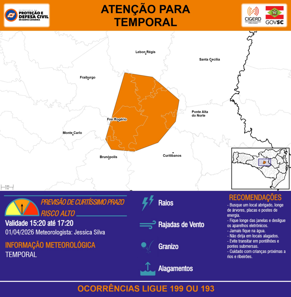 ATENÇÃO – 01/04 15:20 – TEMPORAL com RAIOS, RAJADAS DE VENTO, GRANIZO e ALAGAMENTOS para os municípios de Brunópolis, Curitibanos, Fraiburgo, Frei Rogério, Lebon Régis, Monte Carlo, Ponte Alta do Norte e Santa Cecília nas próximas 2 horas. Ocorrências ligue 199 ou 193.