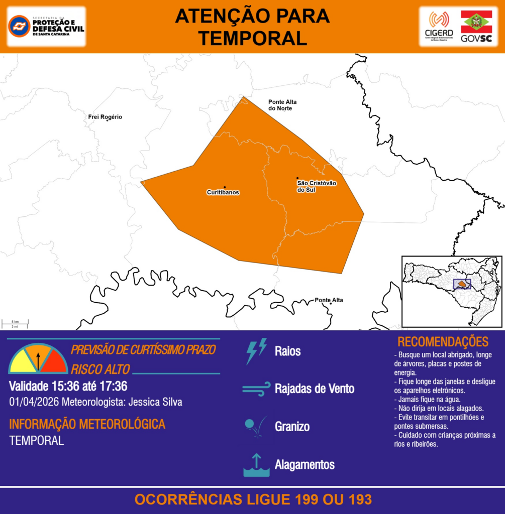 ATENÇÃO – 01/04 15:36 – TEMPORAL com RAIOS, RAJADAS DE VENTO, GRANIZO e ALAGAMENTOS para os municípios de Curitibanos, Frei Rogério, Ponte Alta, Ponte Alta do Norte e São Cristóvão do Sul nas próximas 2 horas. Ocorrências ligue 199 ou 193.