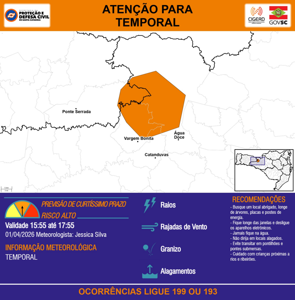 ATENÇÃO – 01/04 15:55 – TEMPORAL com RAIOS, RAJADAS DE VENTO, GRANIZO e ALAGAMENTOS para os municípios de Catanduvas, Ponte Serrada, Vargem Bonita e Água Doce nas próximas 2 horas. Ocorrências ligue 199 ou 193.