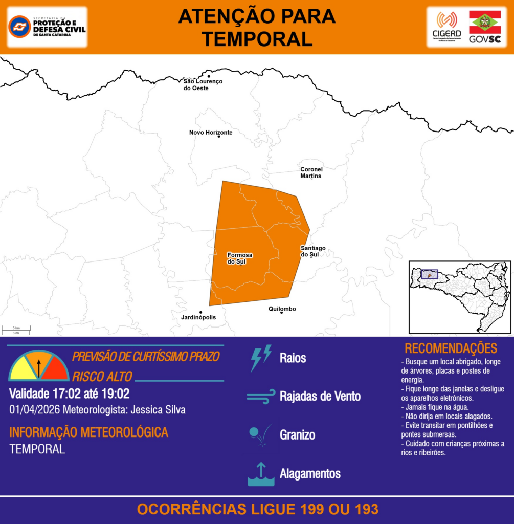 ATENÇÃO – 01/04 17:02 – TEMPORAL com RAIOS, RAJADAS DE VENTO, GRANIZO e ALAGAMENTOS para os municípios de Coronel Martins, Formosa do Sul, Novo Horizonte, Quilombo, Santiago do Sul e São Lourenço do Oeste nas próximas 2 horas. Ocorrências ligue 199 ou 193.