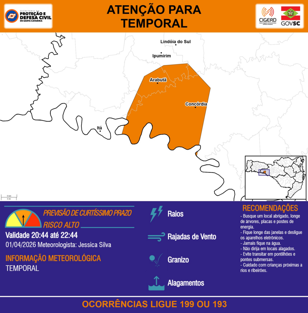 ATENÇÃO – 01/04 20:44 – TEMPORAL com RAIOS, RAJADAS DE VENTO, GRANIZO e ALAGAMENTOS para os municípios de Arabutã, Concórdia, Ipumirim, Itá e Lindóia do Sul nas próximas 2 horas. Ocorrências ligue 199 ou 193.
