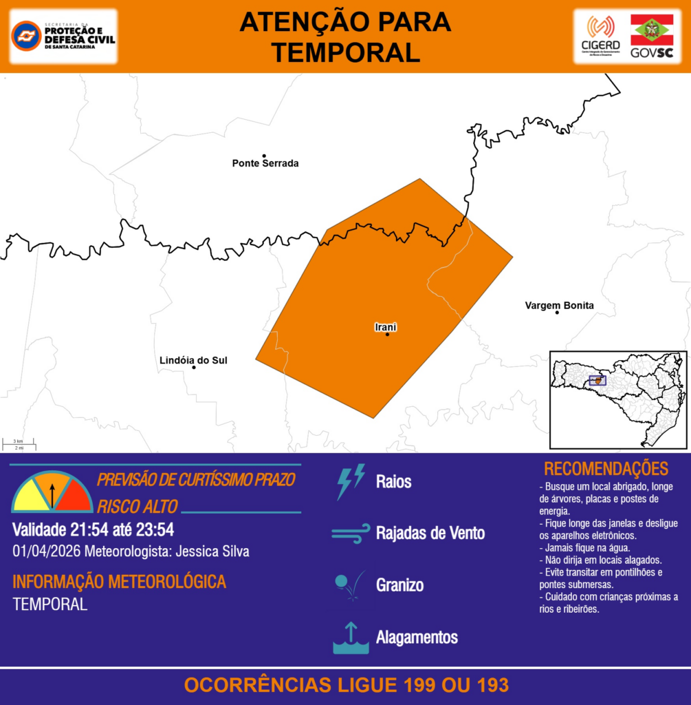 ATENÇÃO – 01/04 21:54 – TEMPORAL com RAIOS, RAJADAS DE VENTO, GRANIZO e ALAGAMENTOS para os municípios de Irani, Lindóia do Sul, Ponte Serrada e Vargem Bonita nas próximas 2 horas. Ocorrências ligue 199 ou 193.