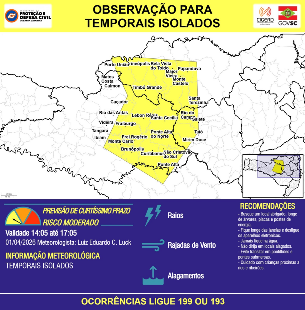 OBSERVAÇÃO – 01/04 14:05 – TEMPORAIS ISOLADOS com RAIOS, RAJADAS DE VENTO e ALAGAMENTOS pontuais para os municípios de Bela Vista do Toldo, Brunópolis, Calmon, Caçador, Curitibanos, Fraiburgo, Frei Rogério, Ibiam, Irineópolis, Lebon Régis, Major Vieira, Matos Costa, Mirim Doce, Monte Carlo, Monte Castelo, Papanduva, Ponte Alta, Ponte Alta do Norte, Porto União, Rio das Antas, Rio do Campo, Salete, Santa Cecília, Santa Terezinha, São Cristóvão do Sul, Taió, Tangará, Timbó Grande e Videira nas próximas 3 horas. Ocorrências ligue 199 ou 193.
