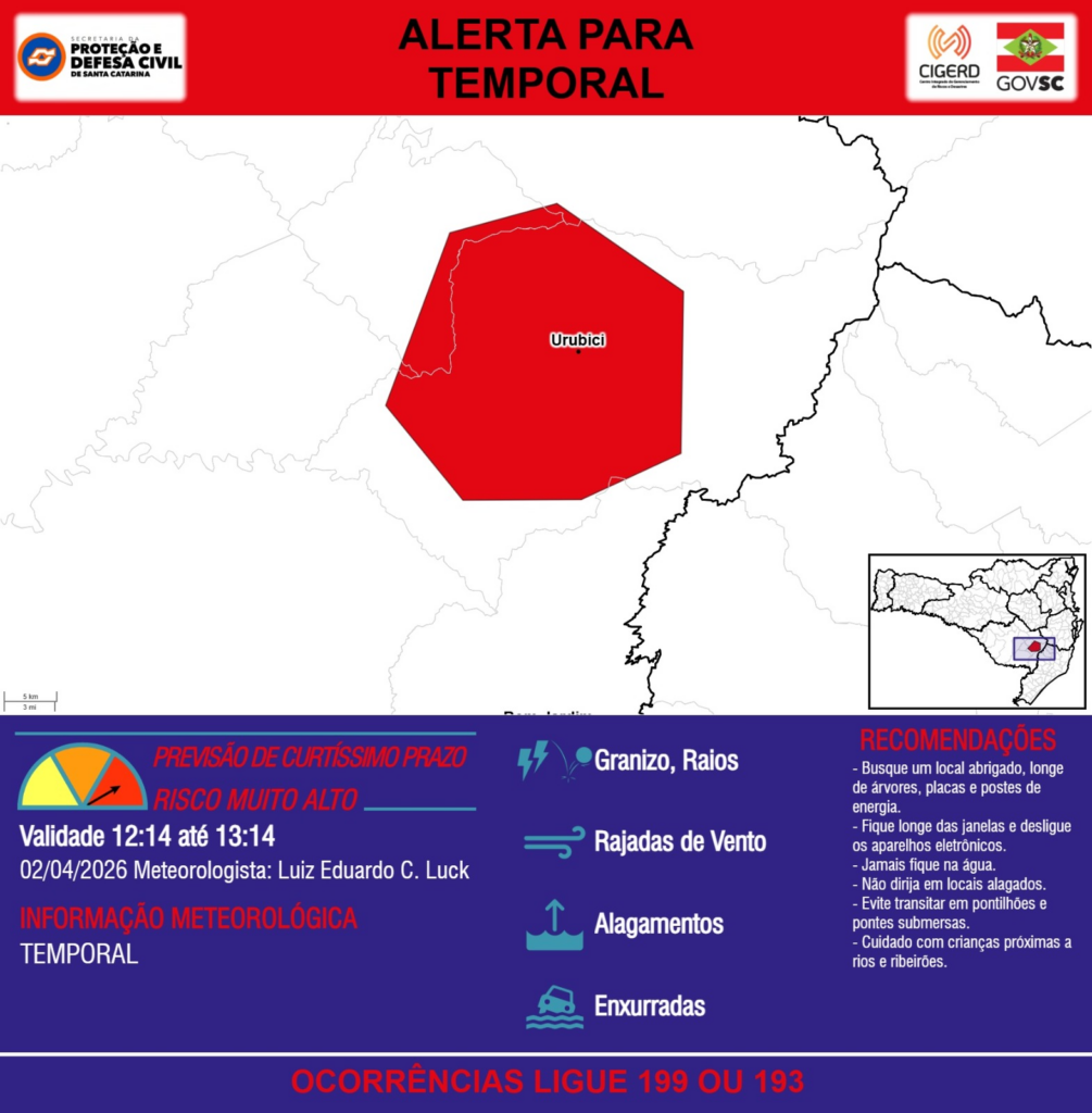 ALERTA – 02/04 12:14 – TEMPORAL com RAJADAS DE VENTO, ALAGAMENTOS, GRANIZO, RAIOS e risco de ENXURRADAS para os municípios de Bom Jardim da Serra, Bom Retiro, Urubici na próxima hora. Ocorrências ligue 199 ou 193.