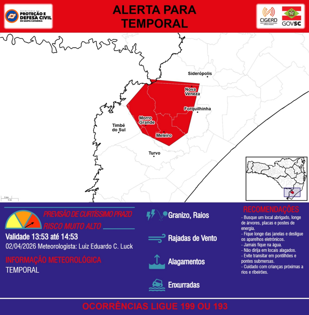 ALERTA – 02/04 13:53 – TEMPORAL com RAJADAS DE VENTO, ALAGAMENTOS, GRANIZO, RAIOS e risco de ENXURRADAS para os municípios de Bom Jardim da Serra, Forquilhinha, Meleiro, Morro Grande, Nova Veneza, Siderópolis, Timbé do Sul e Turvo na próxima hora. Ocorrências ligue 199 ou 193.