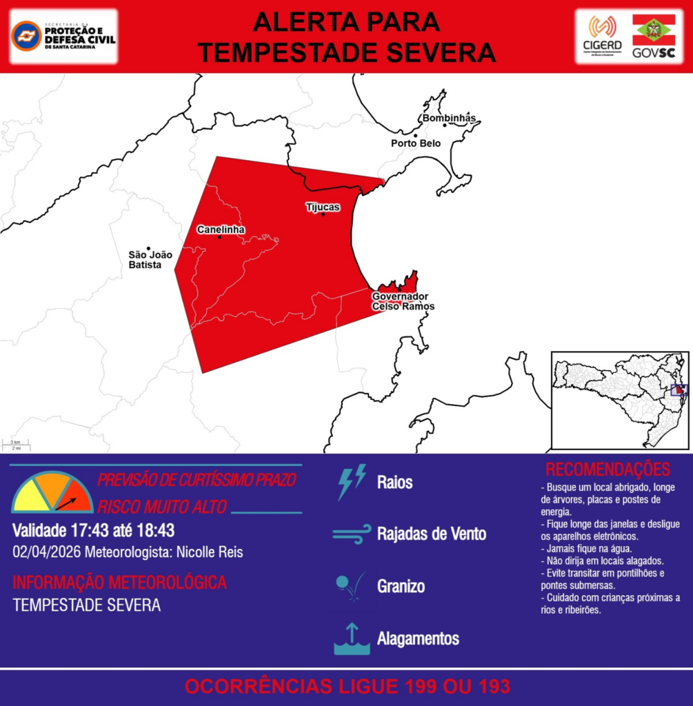 ALERTA – 02/04 17:43 – TEMPESTADE SEVERA com RAIOS, RAJADAS DE VENTO, GRANIZO e ALAGAMENTOS para os municípios de Biguaçu, Bombinhas, Canelinha, Governador Celso Ramos, Porto Belo, São João Batista e Tijucas na próxima hora. Ocorrências ligue 199 ou 193.