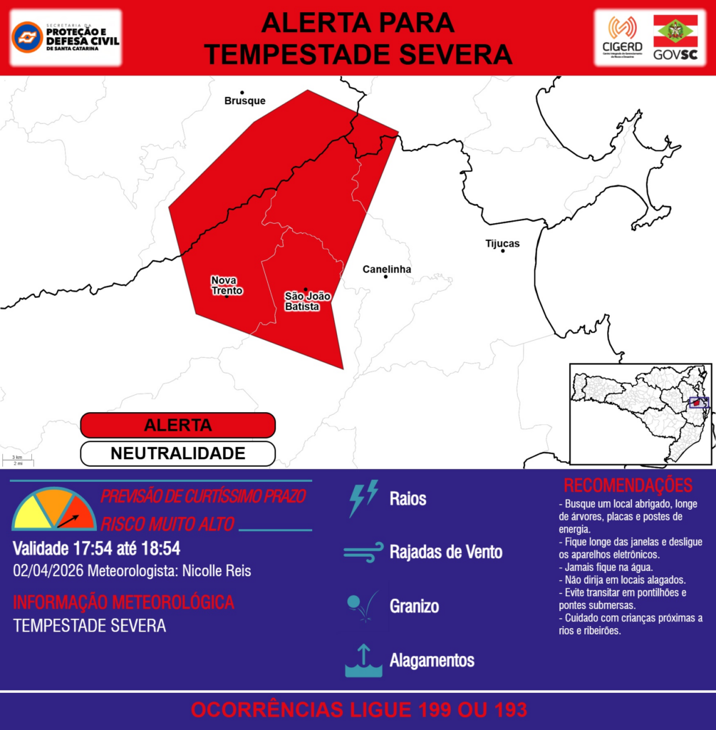 ALERTA – 02/04 17:54 – TEMPESTADE SEVERA com RAIOS, RAJADAS DE VENTO, GRANIZO e ALAGAMENTOS para os municípios de Brusque, Camboriú, Canelinha, Major Gercino, Nova Trento, São João Batista e Tijucas na próxima hora. Ocorrências ligue 199 ou 193.