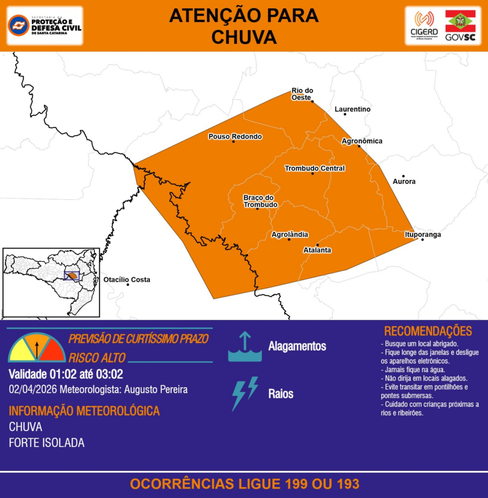 ATENÇÃO – 02/04 01:02 – CHUVA de intensidade forte isolada com ALAGAMENTOS e RAIOS para os municípios de Agrolândia, Agronômica, Atalanta, Aurora, Braço do Trombudo, Ituporanga, Laurentino, Otacílio Costa, Ponte Alta, Pouso Redondo, Rio do Oeste e Trombudo Central nas próximas 2 horas. Ocorrências ligue 199 ou 193.