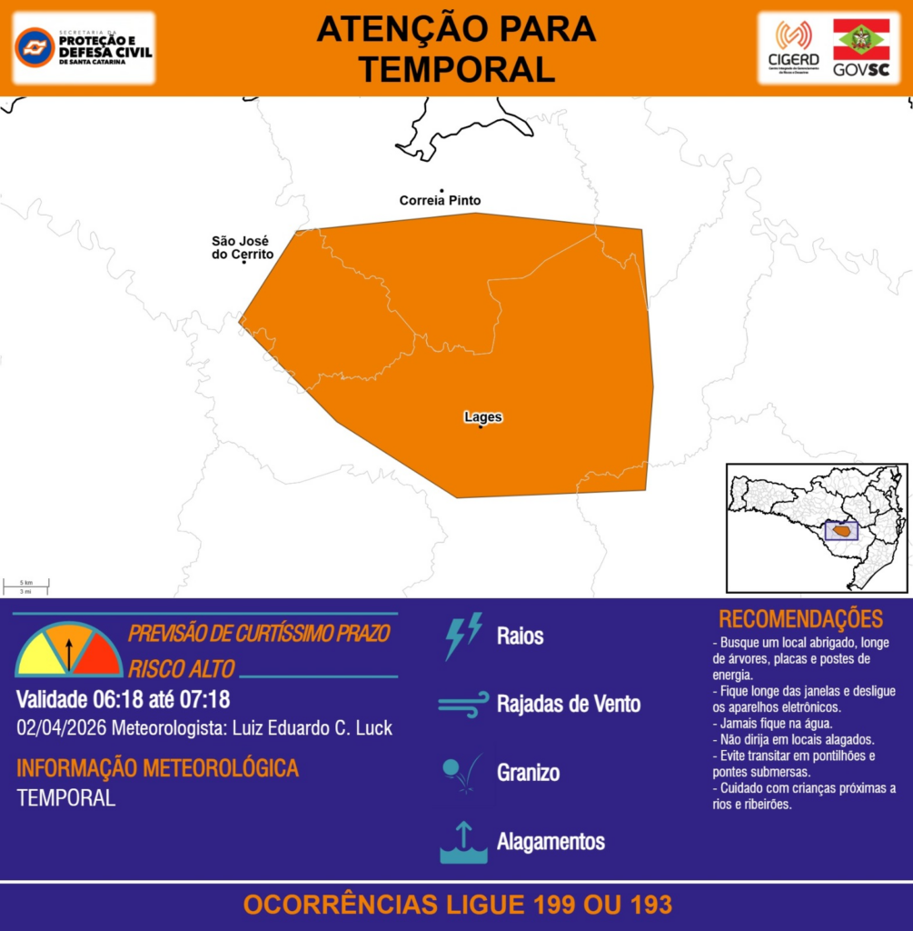 ATENÇÃO – 02/04 06:18 – TEMPORAL com RAIOS, RAJADAS DE VENTO, GRANIZO e ALAGAMENTOS para os municípios de Correia Pinto, Lages e São José do Cerrito na próxima hora. Ocorrências ligue 199 ou 193.