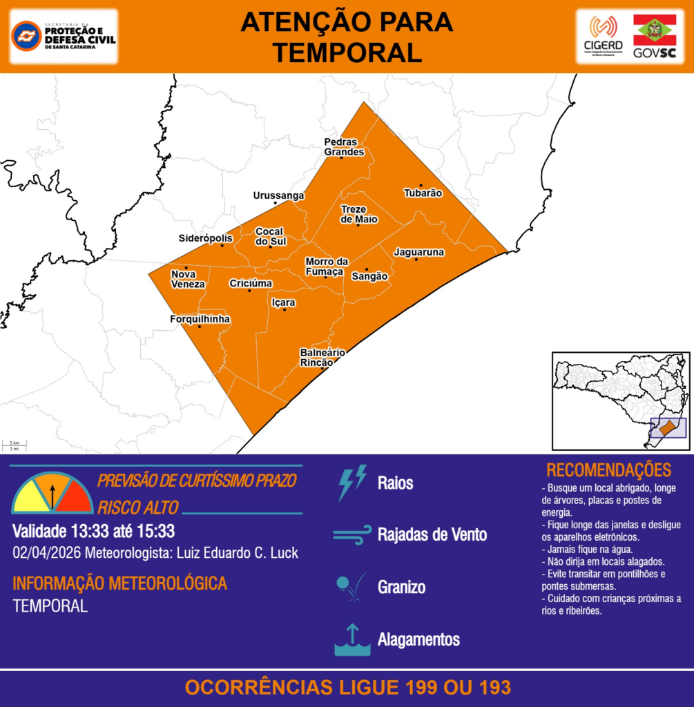 ATENÇÃO – 02/04 13:33 – TEMPORAL com RAIOS, RAJADAS DE VENTO, GRANIZO e ALAGAMENTOS para os municípios de Balneário Rincão, Cocal do Sul, Criciúma, Forquilhinha, Içara, Jaguaruna, Morro da Fumaça, Nova Veneza, Pedras Grandes, Sangão, Siderópolis, Treze de Maio, Tubarão e Urussanga nas próximas 2 horas. Ocorrências ligue 199 ou 193.