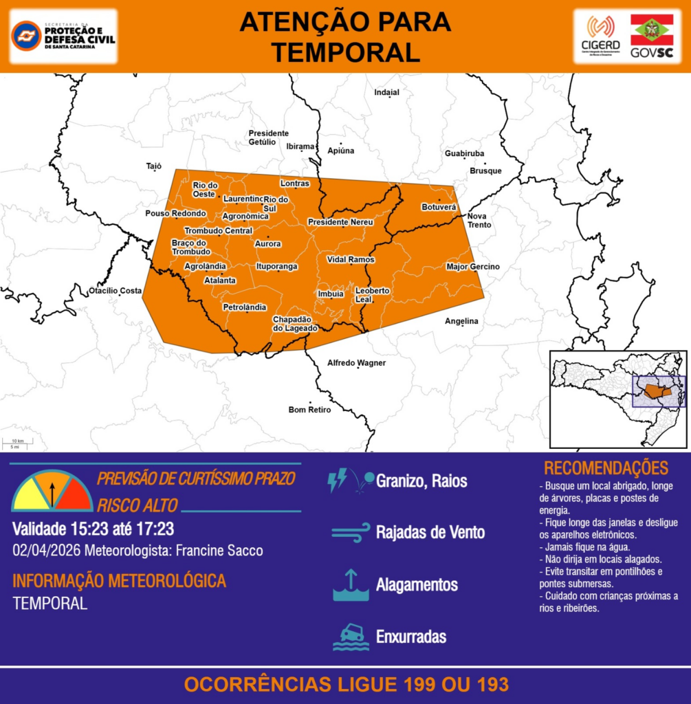 ATENÇÃO – 02/04 15:23 – TEMPORAL com RAJADAS DE VENTO, ALAGAMENTOS, GRANIZO, RAIOS e risco de ENXURRADAS para as regiões do Planalto Sul, Grande Florianópolis, Médio e Alto Vale do Itajaí nas próximas 2 horas. Ocorrências ligue 199 ou 193.