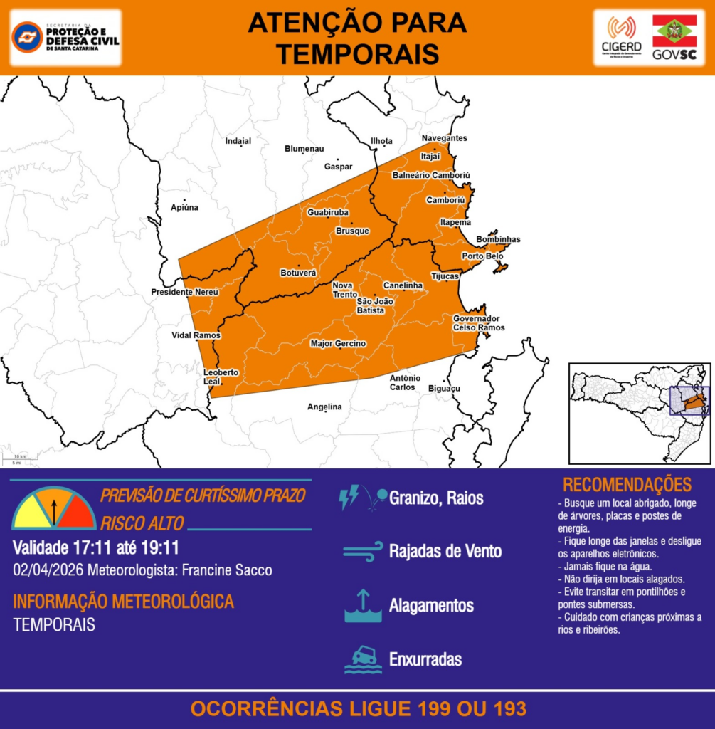 ATENÇÃO – 02/04 17:11 – TEMPORAIS com RAJADAS DE VENTO, ALAGAMENTOS, GRANIZO, RAIOS e risco de ENXURRADAS para as regiões da Grande Florianópolis, Baixo, Médio e Alto Vale do Itajaí nas próximas 2 horas. Ocorrências ligue 199 ou 193.